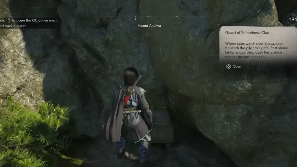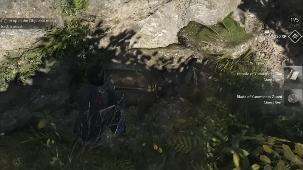 Go to Mount Akaiwa Viewpoint, north of Onitake Shrine in the Tamba region. The chest can be found directly below the viewpoint’s tree branch. Loot it to get the Blade of Yuminess Blade and Guard of Yumminess Clue.