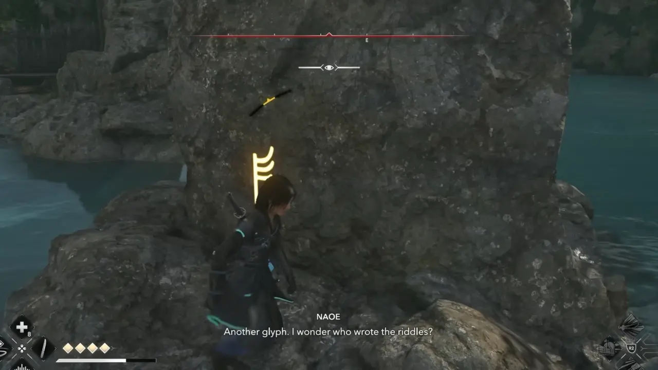 Head to Hiruga Bay and look southwest across the water to find a small island in Lake Suigetsu. Bandits usually camp there, so deal with them first, then check the stone facing the sea to find the glyph riddle.
