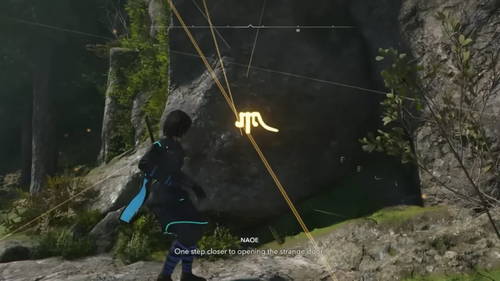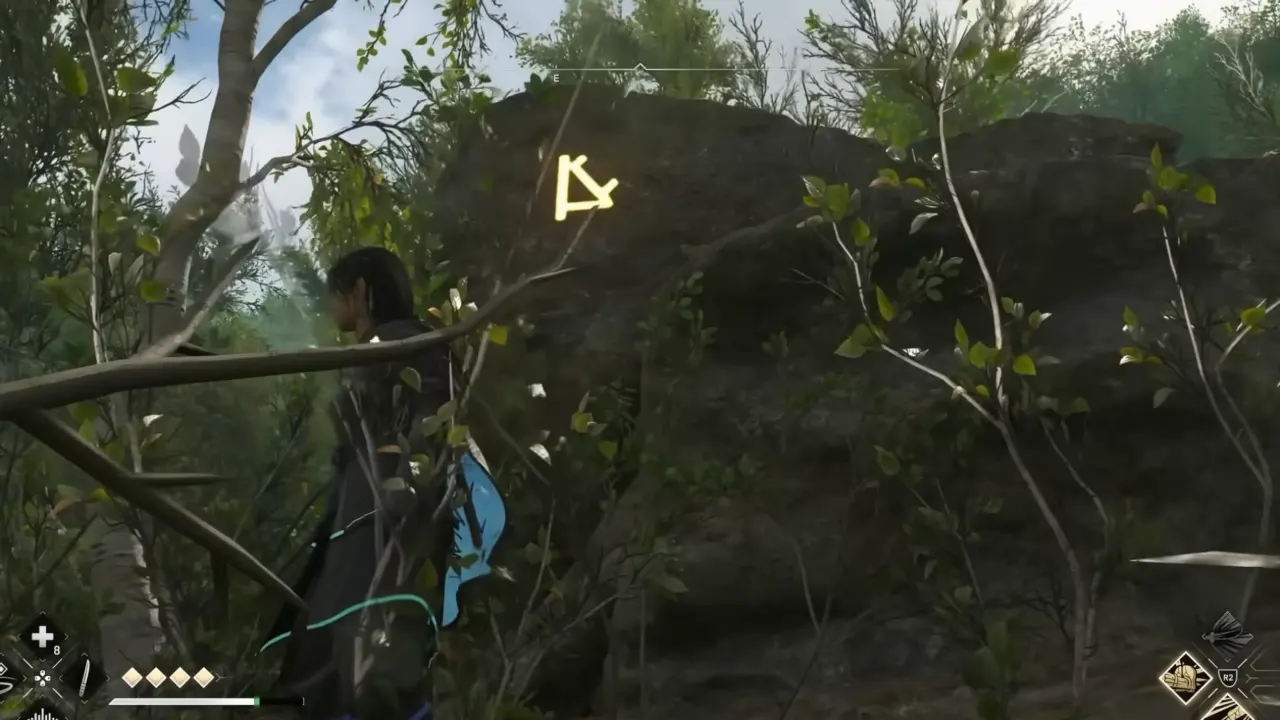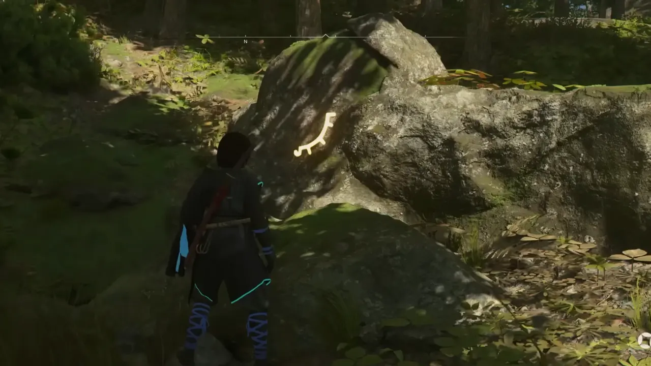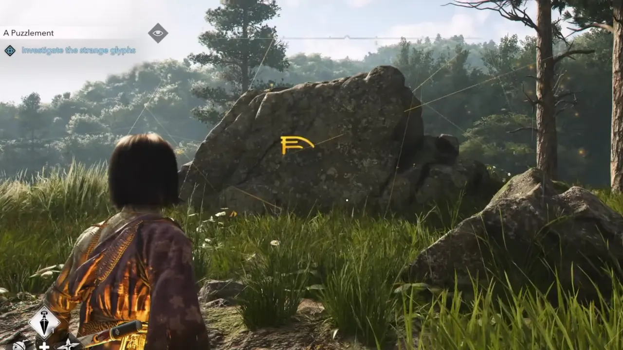 The only glyph the game hands you. From the A Puzzlement quest entrance, move east toward the marked boulder with the carving. Observe it to unlock the rest of the hunt.