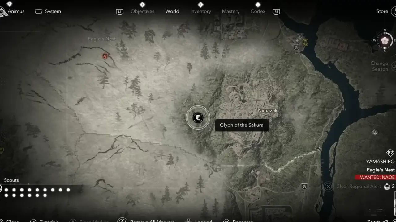 Travel to Yamazaki Castle Viewpoint and hop over the western walls. Follow the forest path lined with stone lanterns. On the left side of the trail, just before the overlook, the sakura-themed glyph can be found on a boulder.