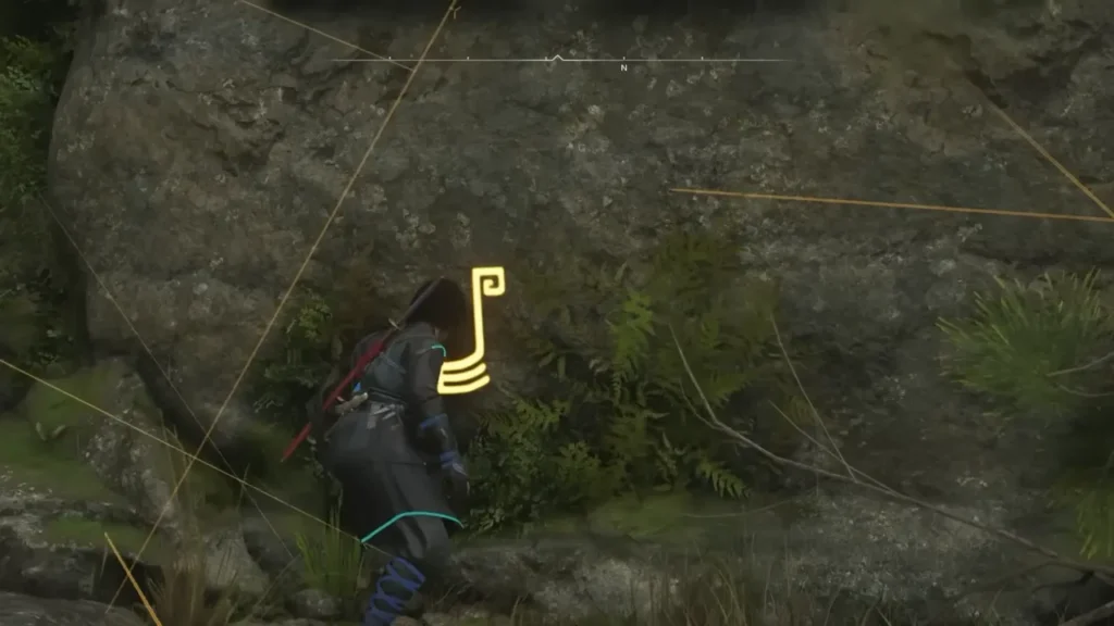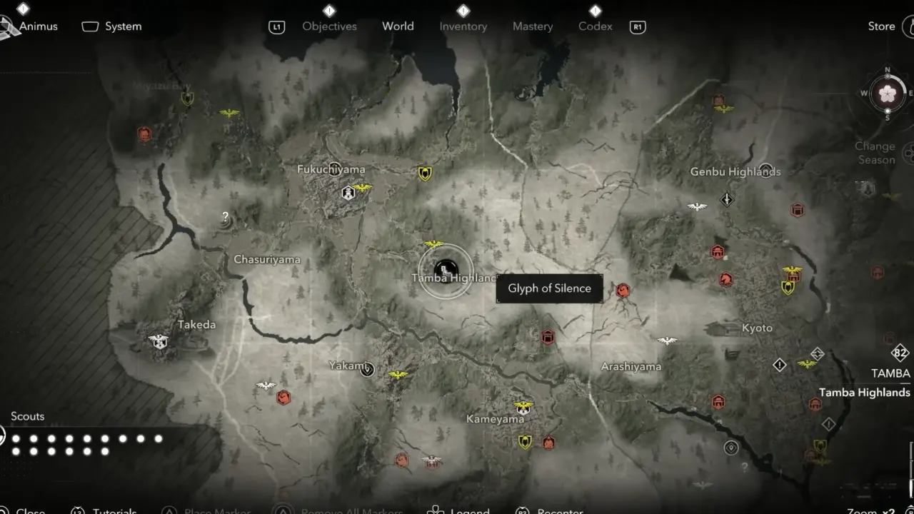 This is the awkward one north of Genbu Highlands. Fast travel to Kuramadera Pagoda, then take the northern trail into the mountain. There’s a shallow pond between lanterns; to the right of the bamboo grove is a climbable section that lets you scale the slope. The glyph is on the summit ridge overlooking the forest.