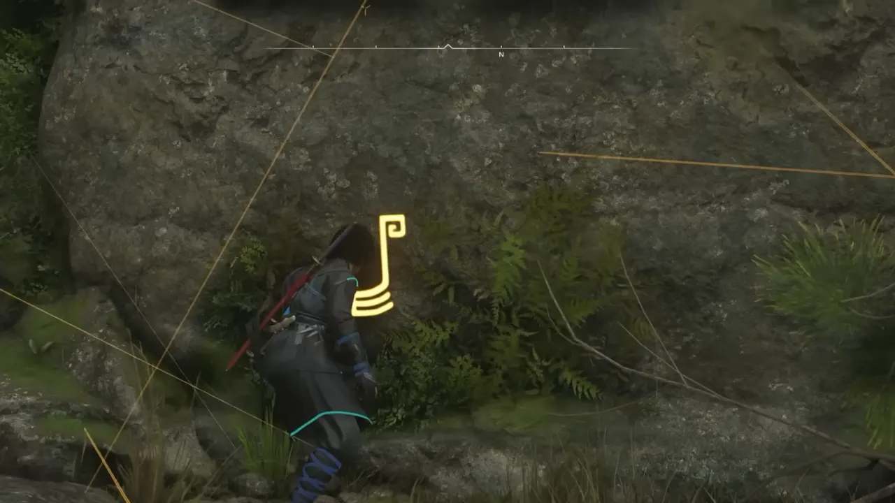 Fast travel to Sakamoto, then follow the western road into the partially deforested foothills southeast of the Mouth Hei area. From under the ruined watchtower ridge, climb the slope to find the glyph facing the valley.