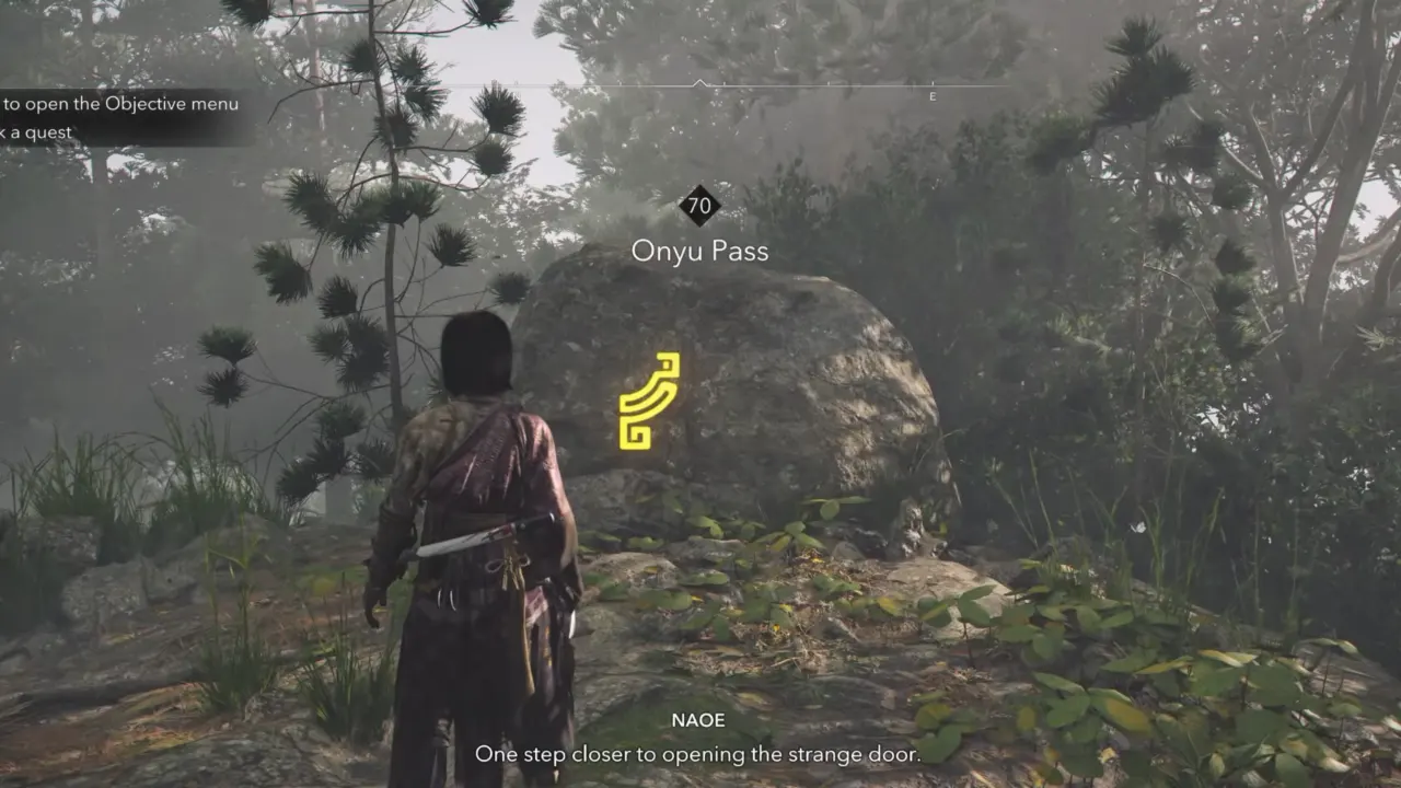 Unless you have unlocked Yasuke as a playable character, you can start the A Puzzlement quest. Follow the quest marker to head to the Genbu Highlands in northern Yamashiro, not far from Hanazono Castle, where you also begin the Assassin’s Creed Shadows x Attack on Titan story quest. Once there, Naoe and Yasuke will have a good talk with Kinu and Kane in a cutscene, two treasure hunters who have no idea what they’ve found—a sealed Isu vault door covered in glowing symbols.