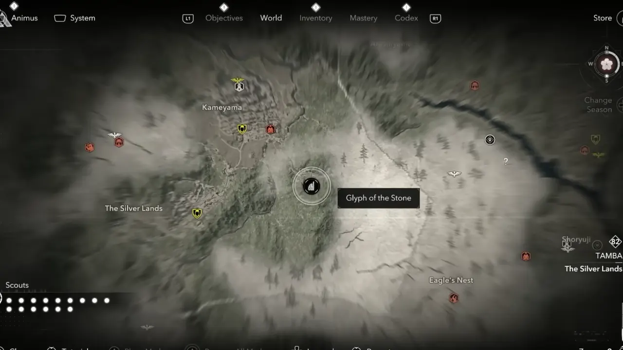 Southeast of Kameyama, there’s a break in the mountains leading to a small enemy camp. Behind the campfire, climb the rocky tiered ledges to reach the glyph riddle carved into the cliff.