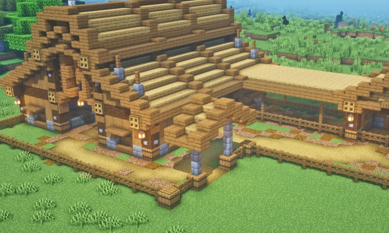 On the ground floor, there’s enough space for 12 llamas or horses to lounge without feeling cramped. If you’re more of a horse fan, you can use this space for breeding the best steeds in Minecraft. Head upstairs, and there’s a loft for storage—a narrow but useful spot for hay bales, chests, and even a cozy bed for the traveling wanderer. Outside, there’s an enclosure where you can feed and tame your animals, and there’s even room for a wall of chests for all your farming supplies. The lighting inside gives it a warm, homey feel, and the stylish archway at the entrance makes it a real head-turner.