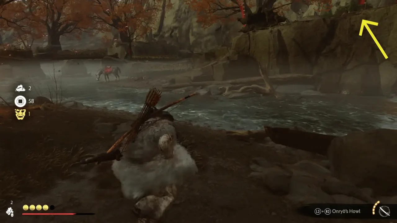 Follow Jubei to the horses, ride the path ahead, and then to the right through the Ishikari River to find Raiders’ bodies. Now follow the trail along the river’s left, choose any choice when asked during the ride, and you’ll come across Oni Raiders near the waterfall. The Duo will hop off the horse and crouch to hide to look at the Oni Raiders camp situation.