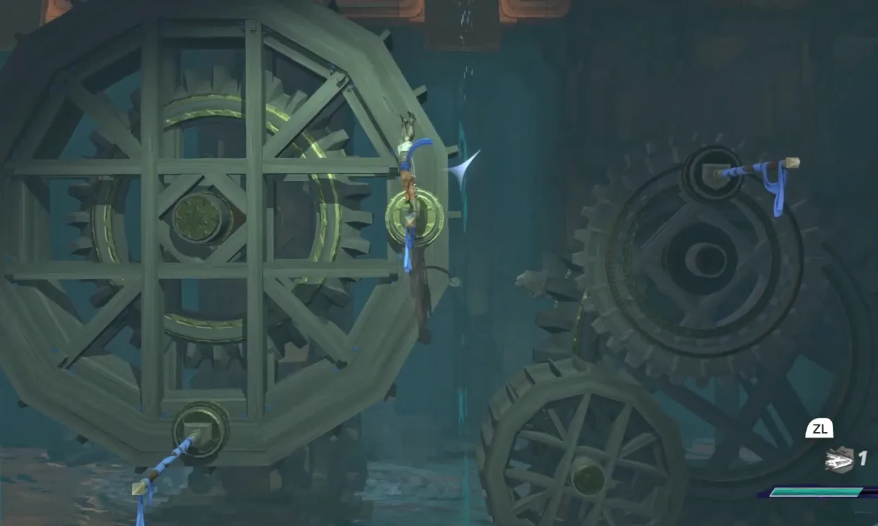 First, you need to jump onto the bottom stick sticking out of the giant wheel. You’ll notice arrows pointing to the next stick on your left – that’s your cue on where to jump next. Once you jump onto this left stick, you will see there’s a metal handle on the wall to your left. Get onto it, and you’ll get a great view of two handles up on the ceiling above the wheel – one on the right and the other on the left.