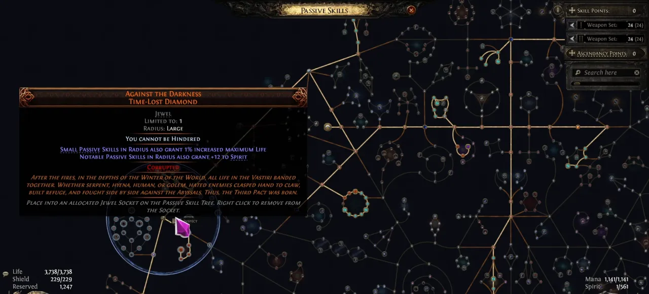 Against the Darkness Time-Lost Diamond is a Unique Jewel in Path of Exile 2, and it’s no exaggeration to say it’s one of the most impactful Jewels in the game if you’re lucky enough to get one with the right modifiers. This Jewel has a Large Radius, so it affects a big area around the Socket on your Passive Skills tree. It applies bonus effects to both Small Passive Nodes and Notable Passive Nodes within its range, turning even simple passives into serious stat boosters depending on your build.