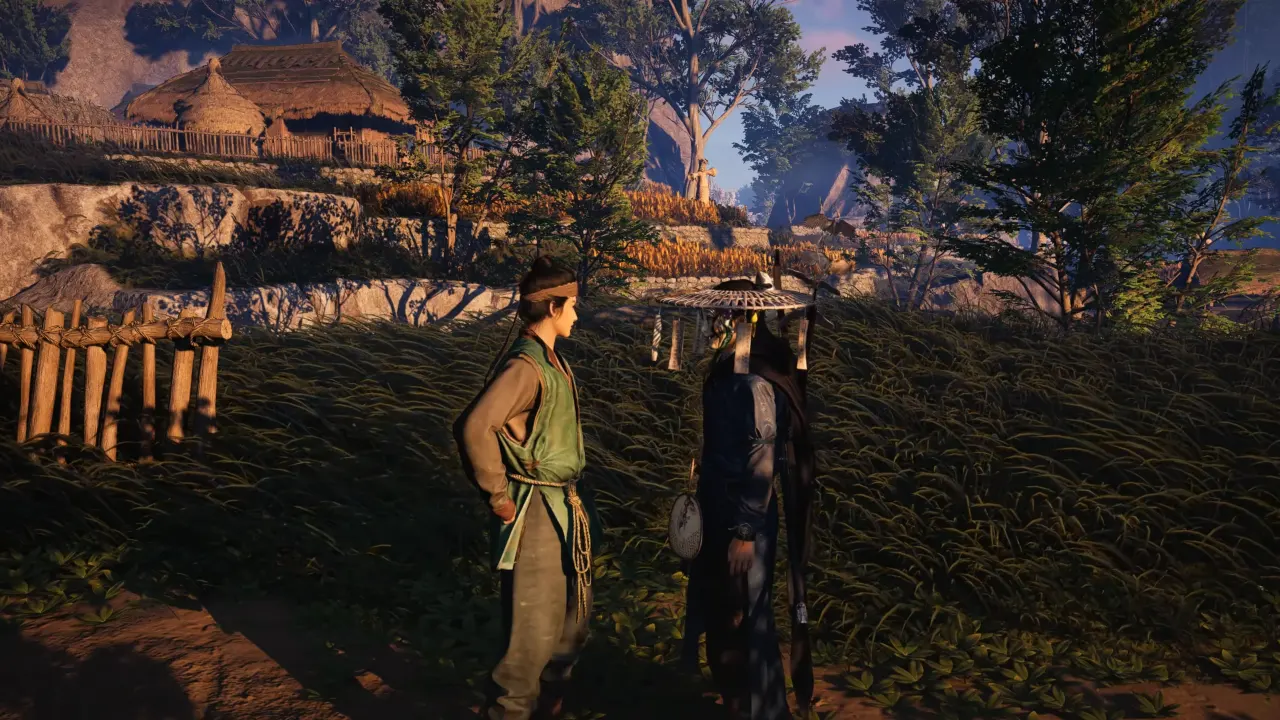 After Shu Shu’er bolts, leave Heaven’s Pier from the road west out of the village towards Blissful Retreat. Stick to the main path, and not far along the road, near a small bridge and a sick goose spot, you’ll find Shu Shu’er being confronted and beaten by masked enforcers. Get to the group and interact with the prompt to trigger the conversation, which resolves the situation and completes the Wandering Tale.